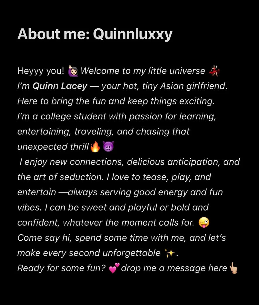 Instruksi Masturbasi, Orgasme, Tittyfuck, Tersedak, Hardcore, Lateks, Kulit, Heels, Kaki Unta, Doggy Style, Tarian Erotis, Berkedip, Fetish Kaki, Stimulasi kaki, Handjob, Pijat, Masturbasi, Mainan Puting, Bermain Peran, Mainan Seks, Striptis, Topless, Rok atas, Anal, Mainan Anal, Blowjob, Tingkat Penis, Krim, Tenggorokan, Dildo atau Vibrator, Dirty Talk, Penetrasi Ganda, Meraba, Penghinaan, Gundik, Pertunjukan Minyak, Memukul, Squirt